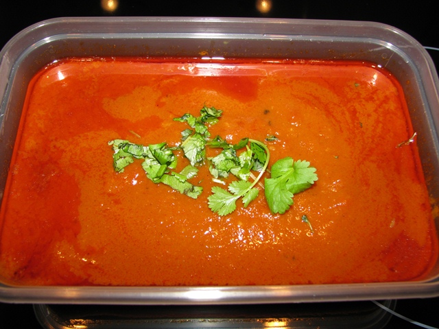 First go with the new pan.  CAs vindaloo done as the sauce.  Popped a few pieces of pre-cooked chicken in.  Lovely!  Fresh coriander this time, but not chopped up properly. The vinegar works well.  Looking forward to doing it again.  On reflection, a bit of potato in there to finish off would have been very nice.