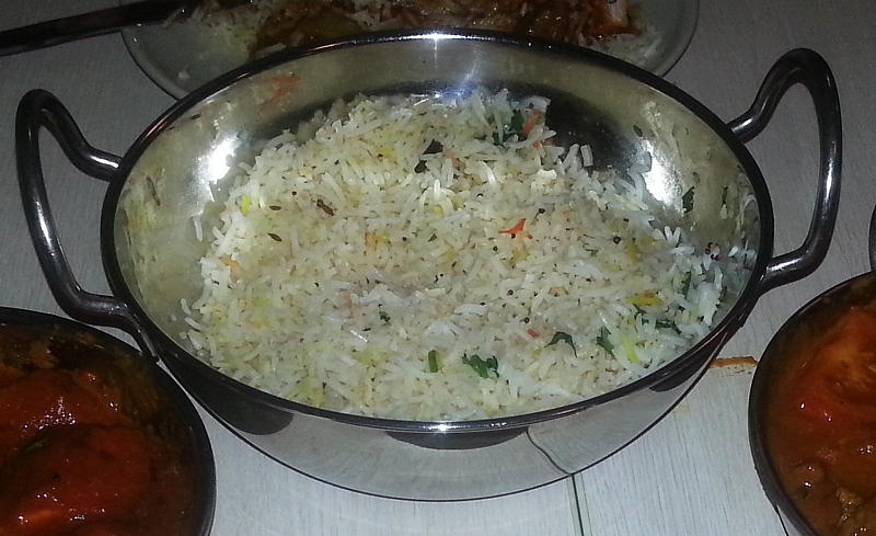 The Naans were great, with a good amount of tasty filling.  The Pilau Rice was nice, fluffy and delicately flavoured (with very generous helpings, too boot!).  The Chicken Tikka Vindaloo was nice and tasty with a good (I would say "right") amount of "bite" for a Vindaloo.  The Chicken Tikka was nice and succulent and delicately flavoured.  The sauce was a great texture and flavour.  The same was true of the Chicken Jalfrezi.
