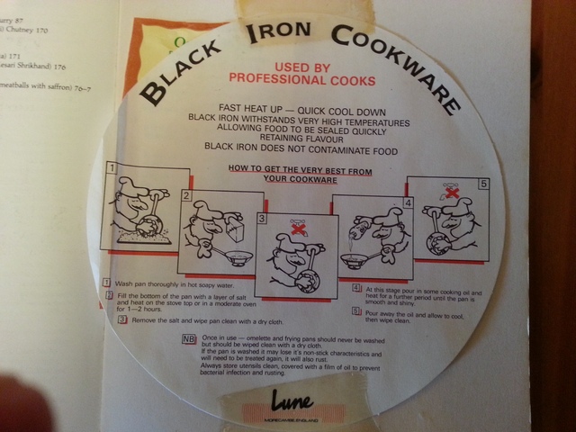 The original instructions that came with my first black iron pan from Dentons in Clapham some 24 years ago, safely tucked away in the back of Pat Chapman's Favourite Restaurant Curries  ;D