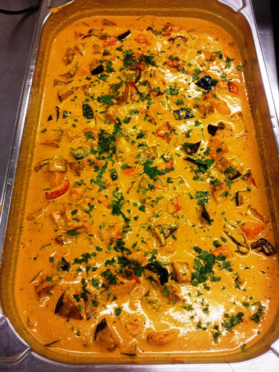 I just made 2 trays of mixed veg which included onion, carrot, peppers, deep fried aubergine and some potatoes, which were all roasted in the oven apart from the aubergine, then added to the sauce at the end.